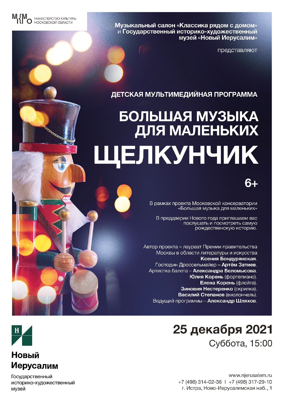 В Новый год — с доброй сказкой! Музыкальный салон «Классика рядом с домом» и Государственный историко-художественный музей «Новый Иерусалим» представили детский музыкальный спектакль «Щелкунчик» в концертном зале музея в рамках проекта Московской консерватории «Большая музыка для маленьких». Спектакль состоится 25 декабря в 15:00.