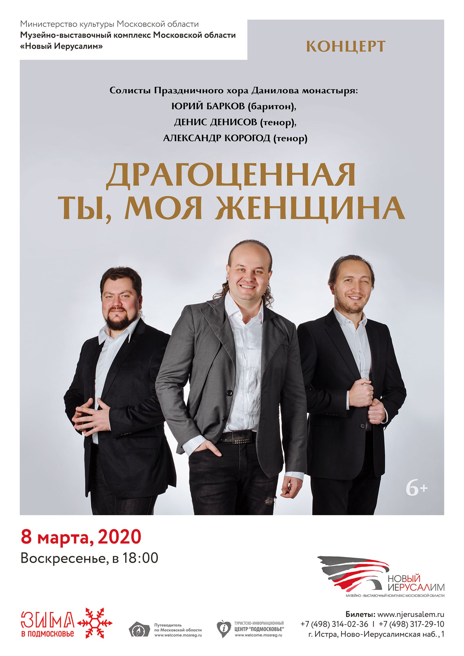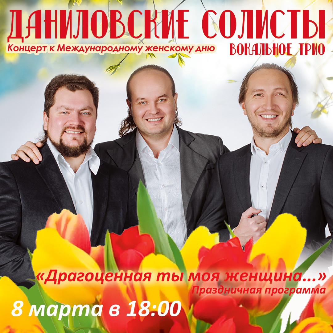8 марта в 18.00, в Международный женский день, на сцене МВК «Новый Иерусалим» выступили солисты Праздничного хора Данилова монастыря: Юрий Барков (баритон), Денис Денисов (тенор) и Александр Корогод (тенор) и посвятили свой концерт прекрасным дамам.
