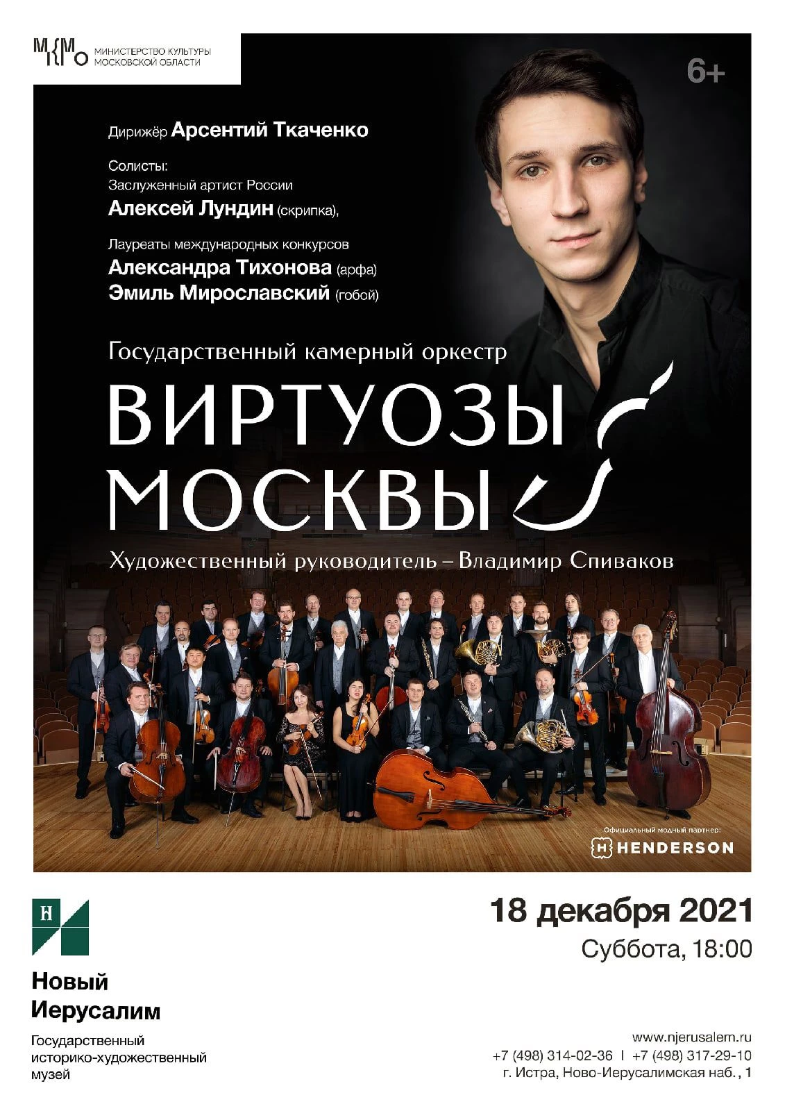18 декабря в 18:00 на сцене музея «Новый Иерусалим» выступил Государственный камерный оркестр «Виртуозы Москвы». Дирижер — Арсентий Ткаченко. Солисты — заслуженный артист России Алексей Лундин (скрипка), лауреаты международных конкурсов Александра Тихонова (арфа) и Эмиль Мирославский (гобой).
