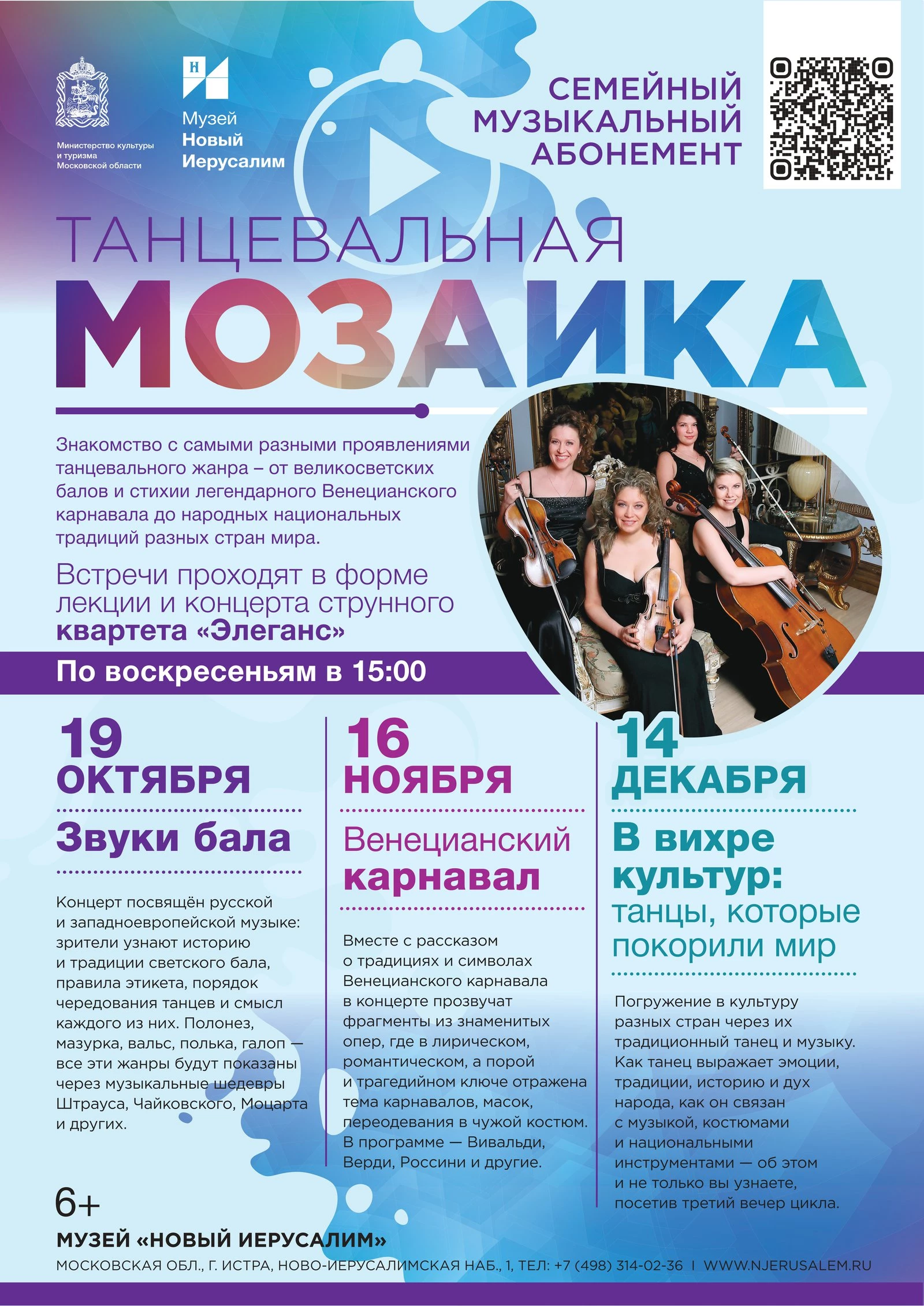 Семейный абонемент музея «Новый Иерусалим» знакомил с самыми разными проявлениями танцевального жанра — от великосветских балов и стихии легендарного Венецианского карнавала до народных национальных традиций самых разных стран мира. Встречи проходили в форме лекции и концерта струнного квартета «Элеганс».