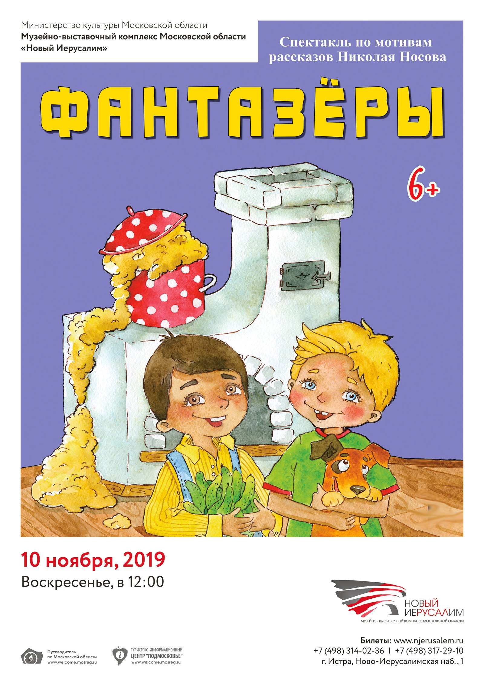 10 ноября в 12.00 театральная компания «КрисАрт» на сцене музейно-выставочного комплекса «Новый Иерусалим» представила премьеру детского спектакля «Фантазёры» (6+). «Фантазёры» — веселый и увлекательный спектакль по мотивам любимых детьми и родителями рассказов знаменитого писателя Николая Носова.