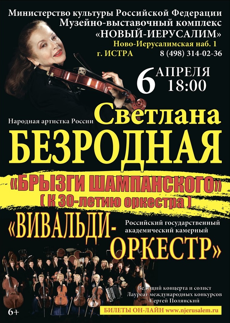6 апреля в 18.00 часов на сцене музейно-выставочного комплекса «Новый Иерусалим» юбилейный концерт Народной артистки России Светланы Безродной и Российского государственного академического камерного «Вивальди-оркестра».