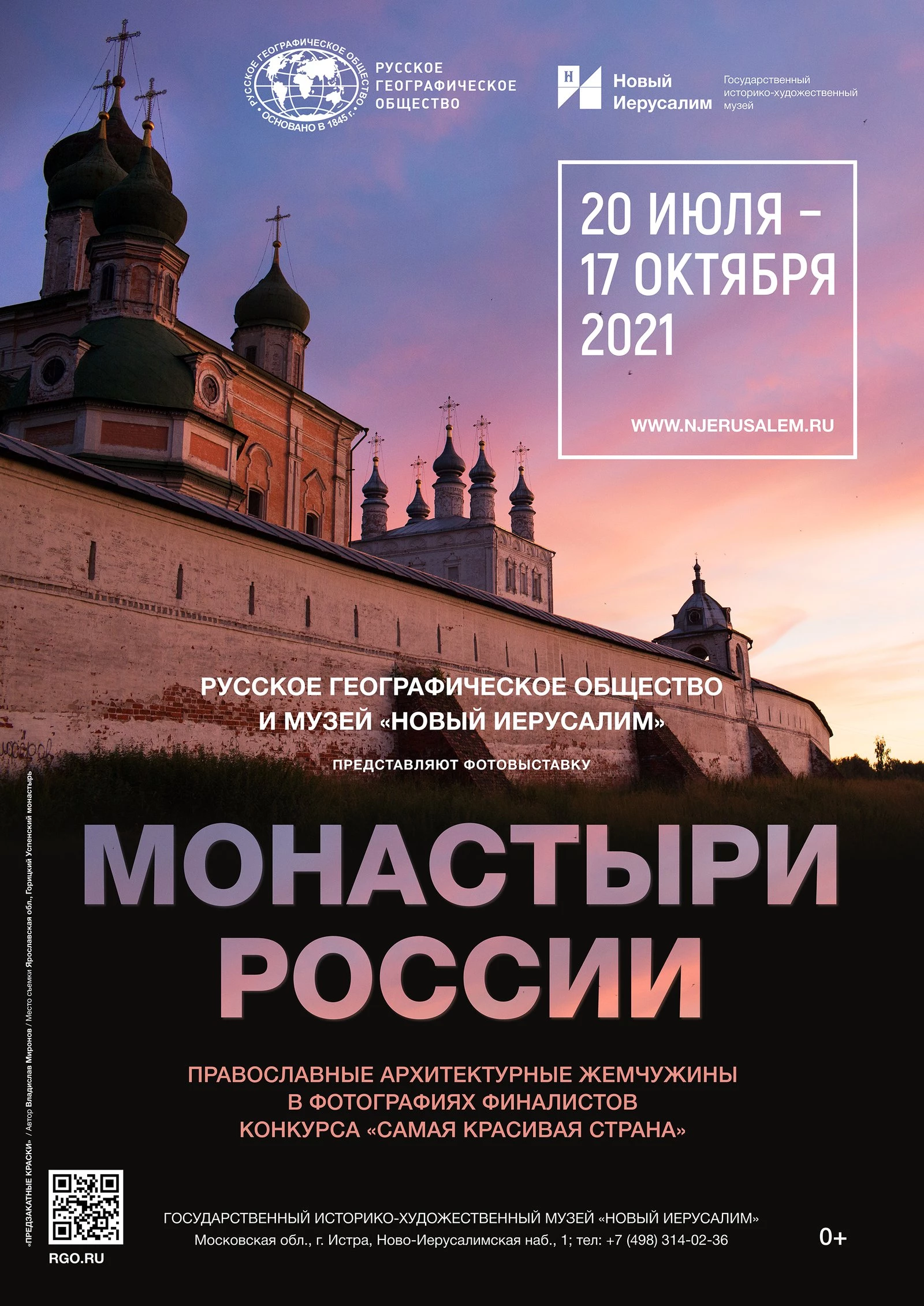 Русское географические общество совместно с Государственным историко-художественным музеем «Новый Иерусалим» с 20 июля до 17 октября 2021 года предлагали гостям музея отправиться в небольшое путешествие по самым удивительным святым местам России. На новой выставке, которую можно было посетить бесплатно, были представлены впечатляющие снимки финалистов и победителей ежегодного фотоконкурса РГО «Самая красивая страна».