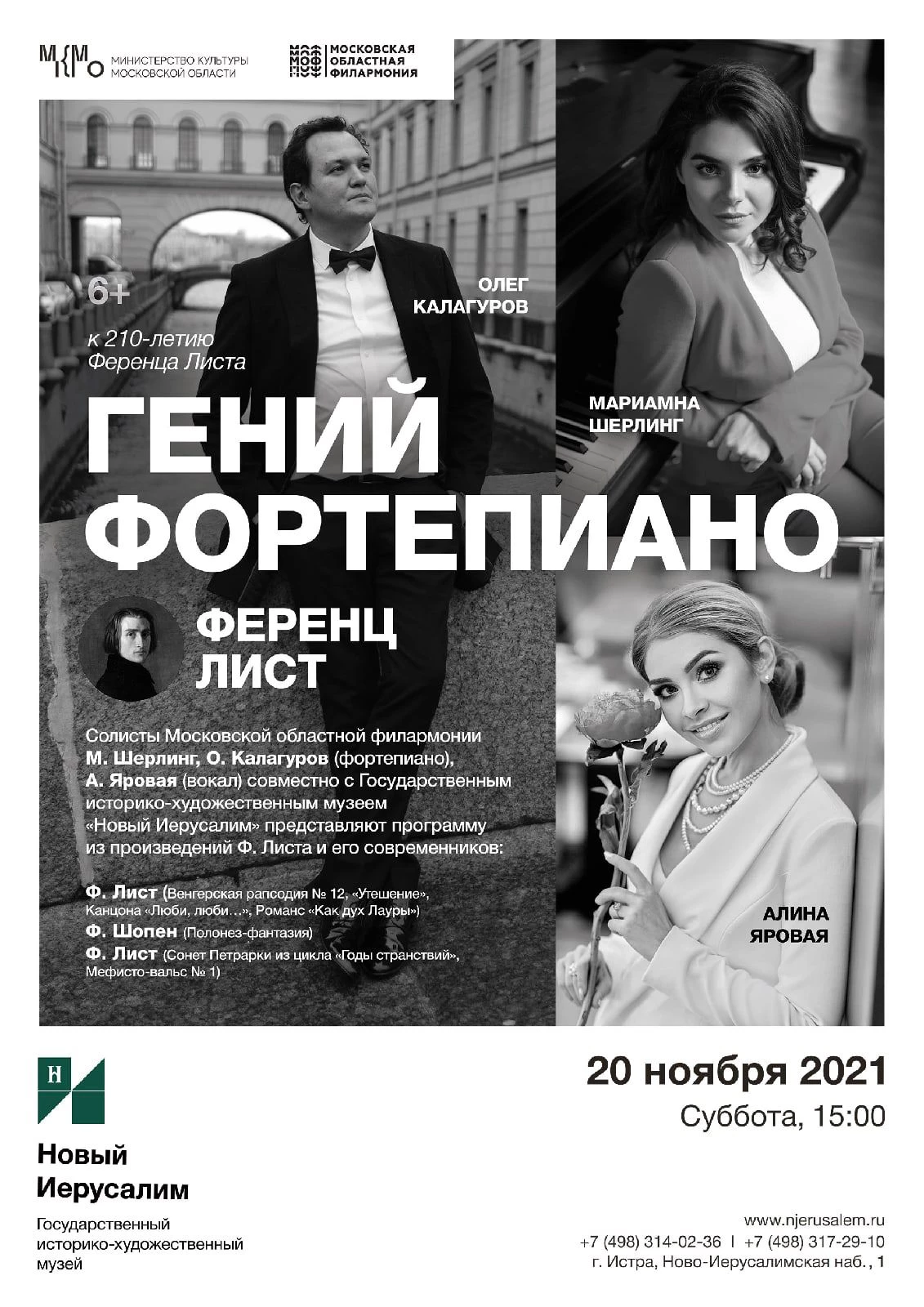 В 2021 году исполнилось 210 лет со дня рождения великого композитора и величайшего пианиста XIX века Ференца Листа. Музей «Новый Иерусалим» и Московская областная филармония организовали концерт «Гений фортепиано.​ Ференц Лист», который состоялся 20 ноября в 15:00.