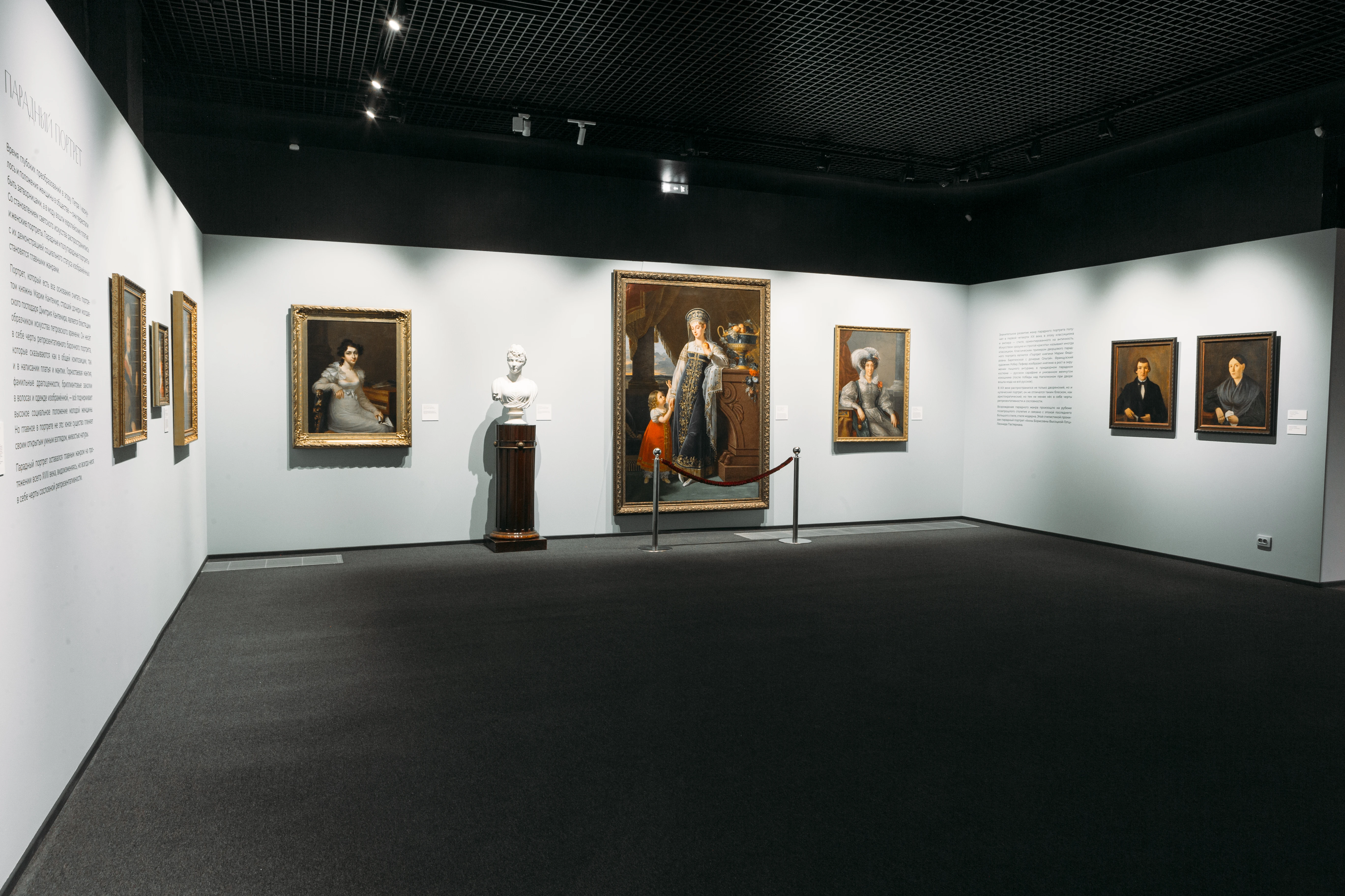 В отдельный раздел выделен парадный портрет XVIII–XIX века, в котором подчеркивается сословная принадлежность модели. Яркие примеры подобных работ — портрет княжны Марии Кантемир, написанный в 1710 году, во времена Петра Великого Иваном Никитиным (?) или портрет княгини Марии Федоровны Барятинской с дочерью Ольгой (1817) кисти Робера Лефевра. В обоих портретах внешняя атрибутика, наряд, убранство модели подчеркивают статус женщины. Получивший блестящее развитие в эпоху классицизма, парадный портрет возрождается в стилистике модерна, о чем свидетельствует одна из лучших работ Леонида Пастернака, изображающая жену известного чаеторговца Анну Борисовну Высоцкую-Готц.