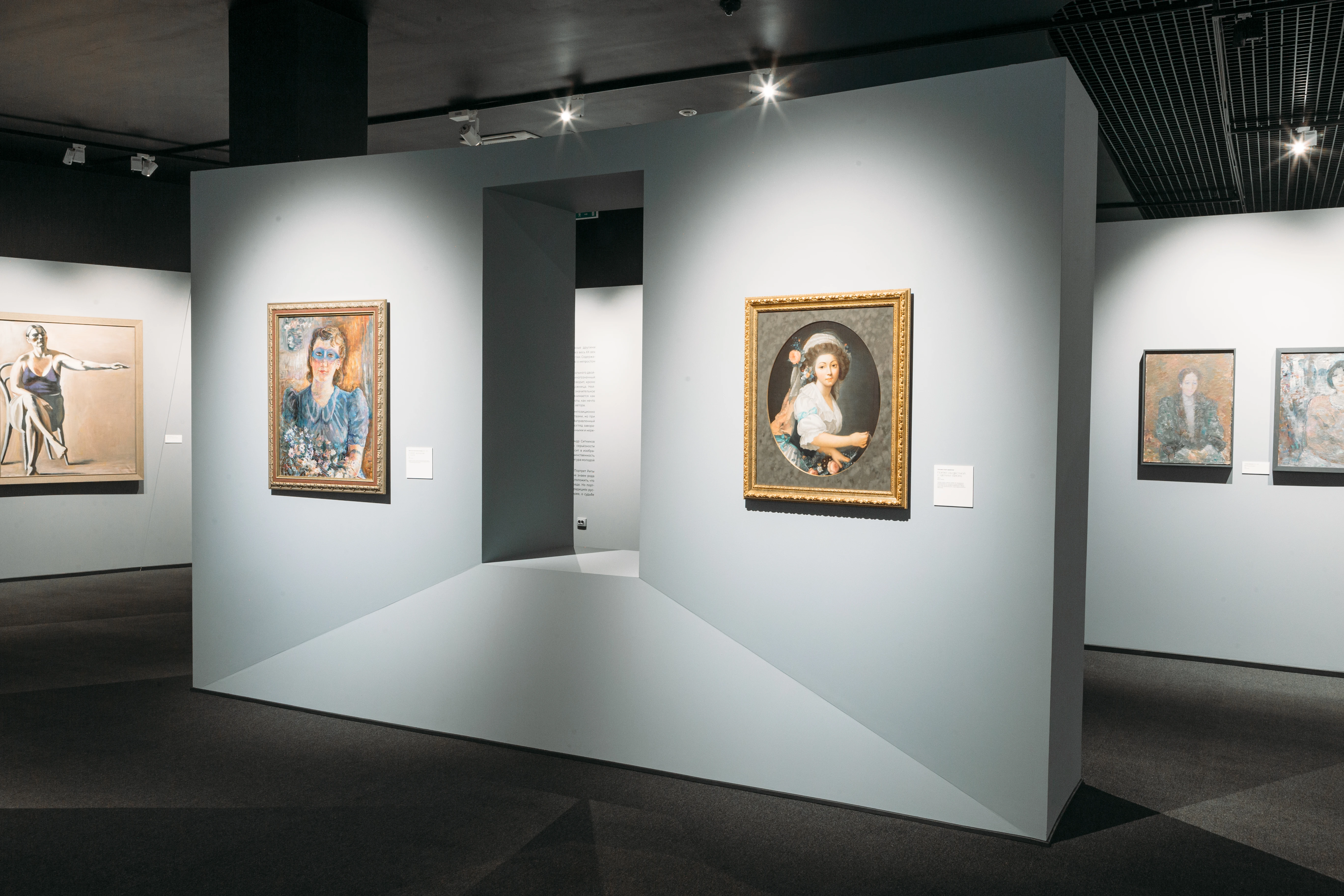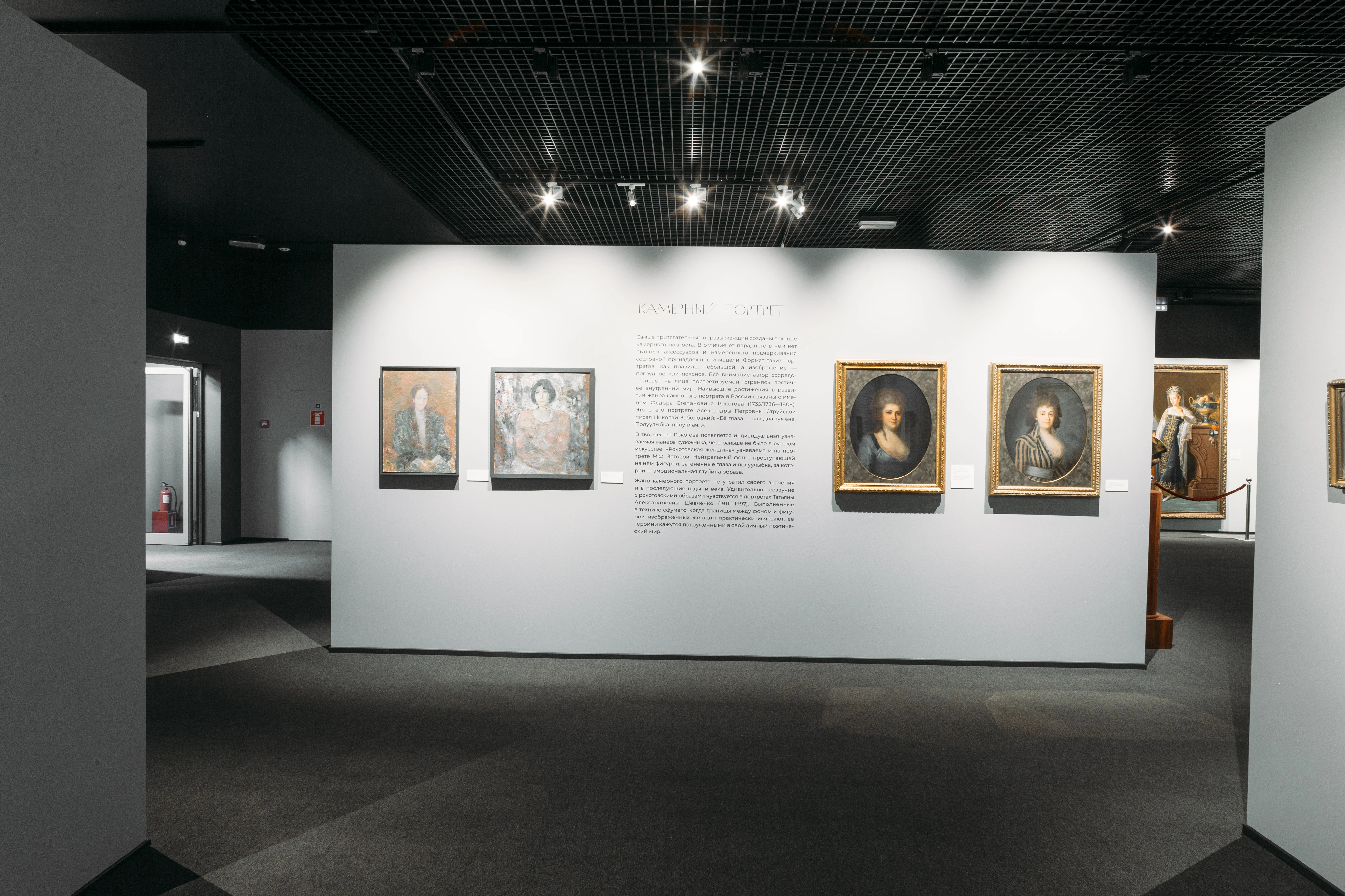 Структура экспозиции позволяет наглядно сопоставить разные эпохи и художественные стили. Например, рядом с портретом Маргариты Францевны Зотовой кисти Рокотова, экспонируются произведения Татьяны Александровны Шевченко, созданные в XX веке. Удаленные друг от друга по времени изображения наделены внутреннем родством, образы словно погружены в свой сугубо личный мир, опоэтизированный авторами.
